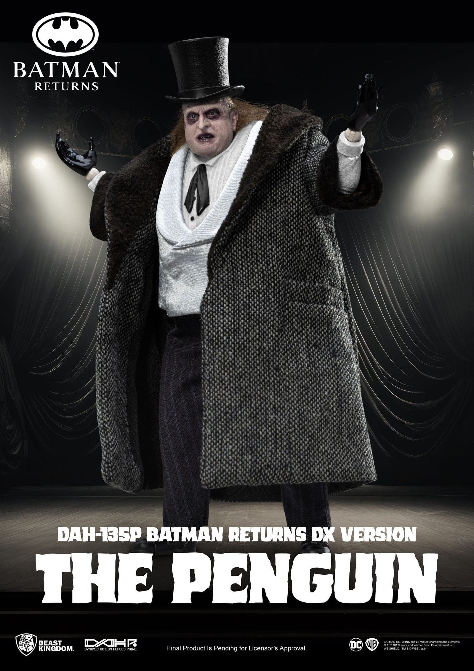 Το υφασμάτινο κοστούμι — σατέν γιλέκο, ριγέ παντελόνι με ελαστικές λεπτομέρειες και παλτό με σκούρο γιακά που αναπαριστά πιστά την εμφάνισή του από την προεκλογική του καμπάνια στο Gotham. Τα deluxe αξεσουάρ, όπως το μαύρο καπέλο, η ομπρέλα-σκελετός και ο οπλισμένος πιγκουίνος, ολοκληρώνουν ιδανικά το display.